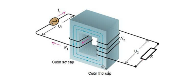 – Cuộn dây N1 và cuộn dây N2 được quấn trên lõi thép khép kín. Đặt một điện áp xoay chiều U1 vào cuộn dây N1, trên cuộn dây này sẽ xuất hiện dòng điện I1 chạy trong dây dẫn, đồng thời trong dây dẫn sẽ xuất hiện từ thông móc vòng cho cả hai cuộn N1 và N2. Cuộn dây N2 được nối với tải thì trên cuộn N2 sẽ xuất hiện dòng điện I2 với điện áp U2. Như vậy, năng lượng của dòng điện xoay chiều đã được truyền từ dây quấn 1 sang dây quấn 2.